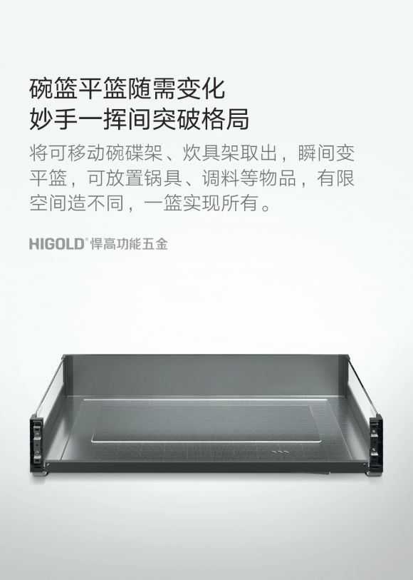希勒3.0平篮可和碗碟三边篮身份对换哦!将可移动碗碟架、炊具架取出,瞬间变平篮,,一篮实现所有。大空间收纳平台,可存放锅盆等大型锅具,也适合各种厨房小家电,如:面包机,榨汁机等。
