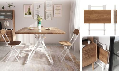 折叠餐桌装饰效果好,将餐桌摆放在厨房当中,一眼看上去不仅洁净,而且适用。这种折叠餐桌的灵敏性十分高,可以依据个人需求将桌面撑起或放下,特别适合小空间户型。