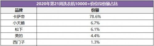 5月27日,中怡康发布第21周洗衣机市场数据,数据显示,1w元以上市场,卡萨帝洗衣机份额78.6%,位居第一;小天鹅份额为6.7%,松下份额为6.1%,美的、西门子份额分别为4.4%和1.3%。