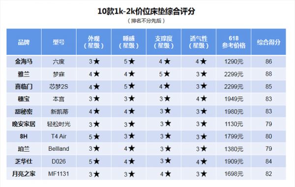 根据销量、品牌知名度等因素,小编筛选出了10款价位为1K-2K床垫进行评测。以下为测评综合得分,排名不分先后。
