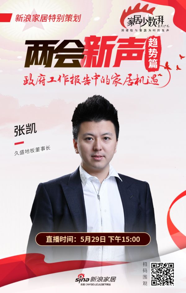 两会期间,政府工作报告中提及了“为企业减负”、“推动降低企业成本”、“稳定和扩大就业”、“增加制造业中长期贷款”、“5G与新基建”等关键信息,为企业未来发展释放了利好信号。5月29日,新浪家居《两会新声》线上沙龙邀请到了梦天家居集团营销总裁屈凡军、久盛地板董事长张凯、浙江世友木业有限公司副总裁张樊、格莱美墙纸总裁杨元等企业家,共探行业未来。以下为久盛地板董事长张凯主要观点——