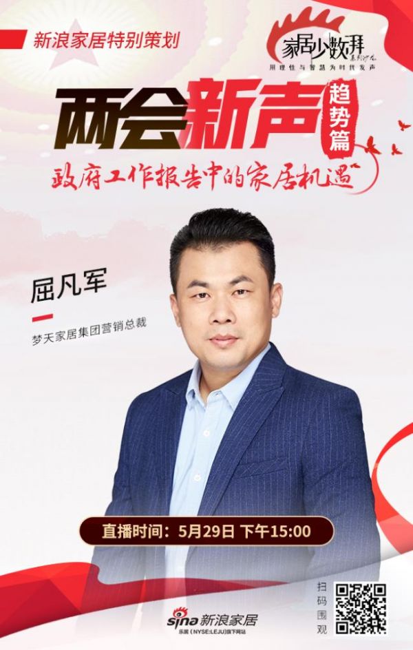 两会期间,政府工作报告中提及了“为企业减负”、“推动降低企业成本”、“稳定和扩大就业”、“增加制造业中长期贷款”、“5G与新基建”等关键信息,为企业未来发展释放了利好信号。5月29日,新浪家居《两会新声》线上沙龙邀请到华浔品味装饰集团董事长夏振华、慕思集团总裁姚吉庆、左右家私董事长黄华坤、久盛地板董事长张凯、梦天家居集团营销总裁屈凡军、浙江世友木业有限公司副总裁张樊等企业家,共探行业未来。以下为梦天家居集团营销总裁屈凡军主要观点——