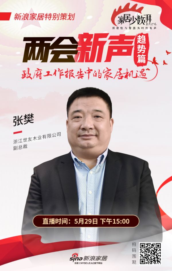 两会期间,政府工作报告中提及了“为企业减负”、“推动降低企业成本”、“稳定和扩大就业”、“增加制造业中长期贷款”、“5G与新基建”等关键信息,为企业未来发展释放了利好信号。5月29日,新浪家居《两会新声》线上沙龙邀请到了梦天家居集团营销总裁屈凡军、久盛地板董事长张凯、浙江世友木业有限公司副总裁张樊、格莱美墙纸总裁杨元等企业家,共探行业未来。以下为浙江世友木业有限公司副总裁张樊的主要观点——