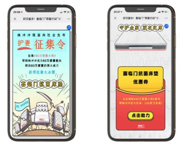 同时,为倡议“全民禁菌”行动,喜临门在品牌年轻化的道路上主动出击,自造 IP-林冲冲,禁军教头故事新编,打造“卖萌”的主角人设,其 H5 以“脑洞大开”的动漫画风吸引年轻消费群体的有效关注。