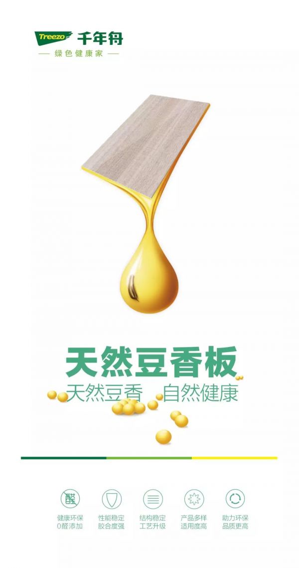 天然豆香板,是千年舟在“倡导0醛生活”的产品品牌战略下重点研发的全新一代环保板材。通过对胶黏剂的更新换代,提取大豆豆粕制造植物蛋白胶,实现从源头解决家装甲醛污染问题。