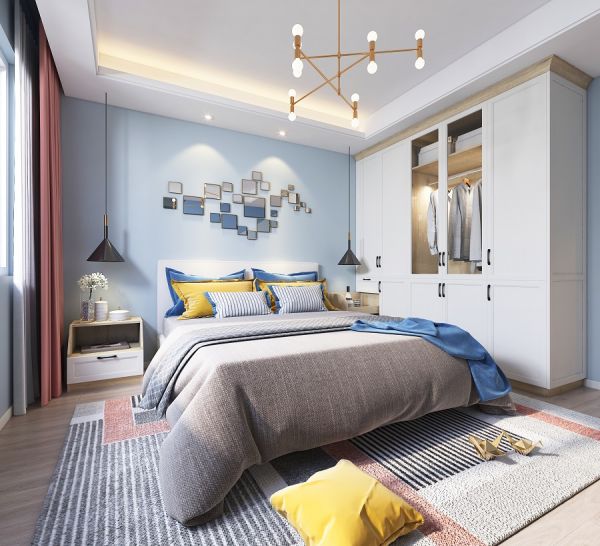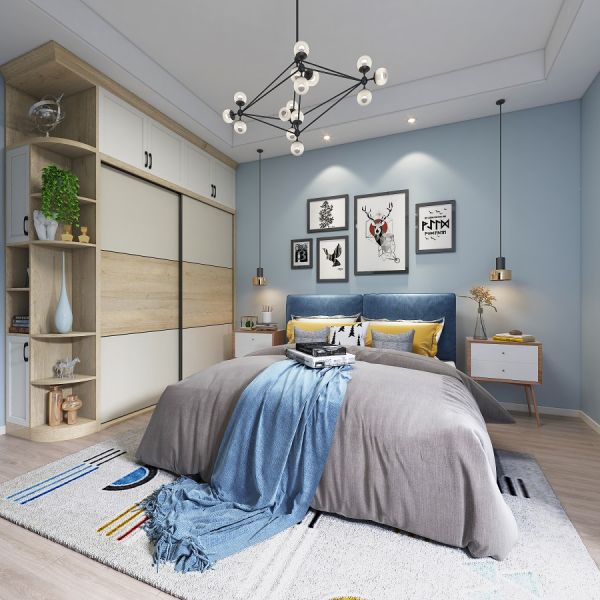 次卧移门衣柜到顶式设计,增大衣柜储藏使用空间,圆弧边柜很好的利用的角落的空间,开放、封闭相结合,不沉闷,不张扬,满足各种储物功能需求。