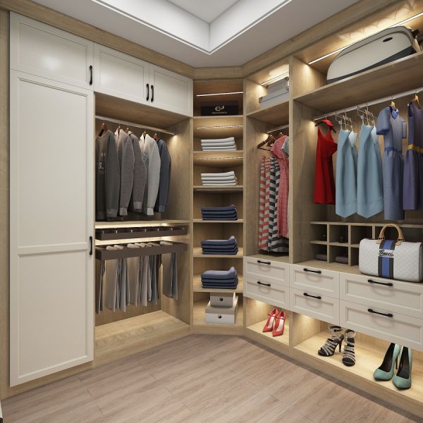主卧衣帽间的整个设计合理布局,符合人体工学的设计便捷拿取的高度,换鞋穿戴,收纳小物件都能合理化安排。层板设有内嵌式层板灯,烘托整体的空间氛围,带给主人温馨感。