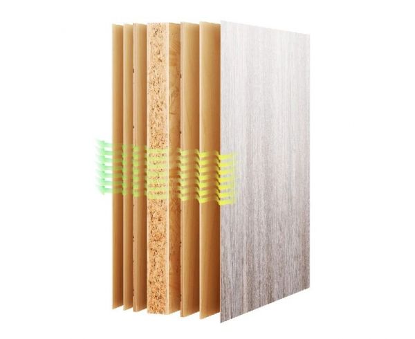 千年舟实木切片OSB板由木质大片刨花施胶后定向铺装,经热压制成长度或宽度方向纵横交错定向排列的多层结构板材,再在上下表面胶合中板、单板和浸渍胶膜饰面纸,形成的复合型生态板。