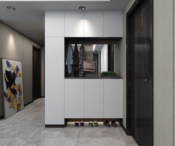 玄关是家的第一印象,好的玄关能给客人很好的观感。干净简约的设计,低层收纳鞋子,方便换鞋,中间悬挂区外套、包包随手挂,出门前照照镜子,看看自己美美的妆容、衣着,美好的一天从这里开始。