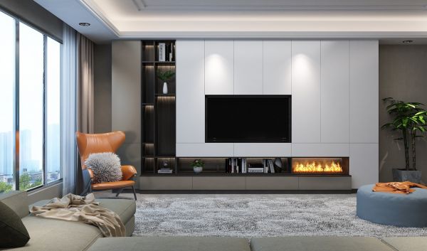 客厅电视柜采用现代简约风,黑白咖色的结合,恰到好处的L型开放区,搭上大量浅灰色和跳色软装,使空间更加通透、清爽。