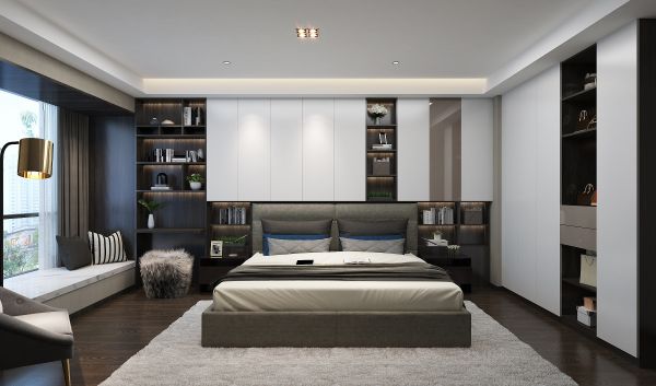 主卧空间大,床头背柜采用到顶式设计,右边设计一个衣柜,超大容量,舒适的软装搭配、时尚的柜体,展现了一个惬意放松的多功能空间。