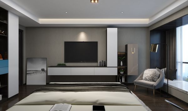 主卧还设有悬挂电视柜及开放闭合柜,用于收纳日常使用的遥控器、小音响、书籍等日常物件。