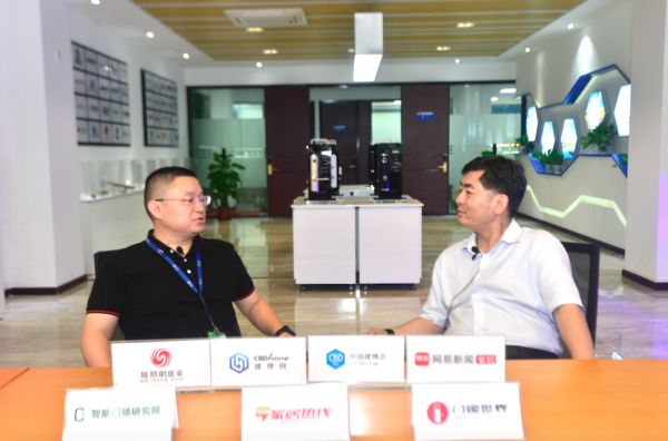图:深圳坚朗海贝斯智能科技有限公司总经理唐春辉(左)与中国建博葵花奖评选委员会秘书长陈军(右)进行亲切交流。