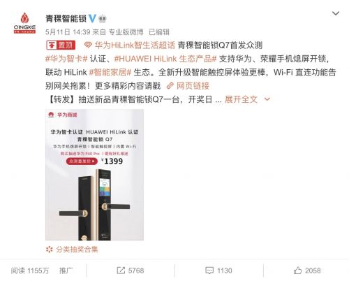 大卖超5200套 青稞Q7智能锁华为商城首发众测圆满成功