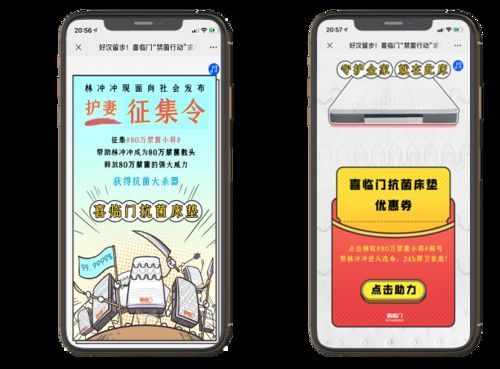 同时,为倡议“全民禁菌”行动,喜临门在品牌年轻化的道路上主动出击,自造IP-林冲冲,禁军教头故事新编,打造“卖萌”的主角人设,其H5以“脑洞 大 开”的动漫画风吸引年轻消费群体的有效关注。