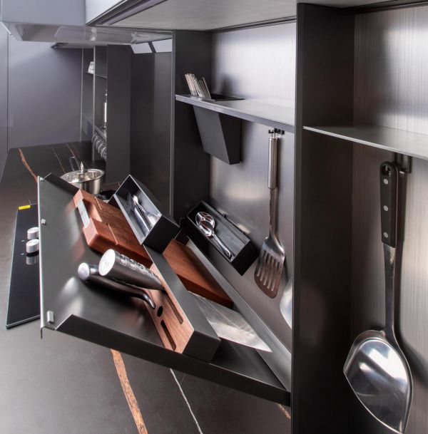 见惯了厨房里的地柜、吊柜等框架,中柜这种设计却是很多人家厨房没有的,因为它是经由我乐家居专利申请后才得以面世的,被称为“第一款真正适合中国人自己的厨房”。中柜系统细分为挂钩、隔板、轨道插座、翻盖插座、调味模块、下翻刀叉和玻璃移门等7大功能模块,将国人使用最为频繁的小厨具上墙设计,人们可以快捷拿取,既避免多次弯腰或转身翻找小物件徒耗时间,又能减少堆放,避免沾上油污,方便打扫。
