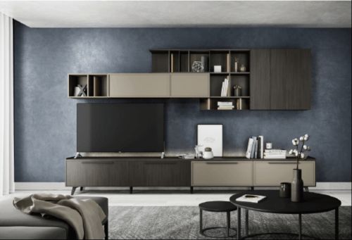 客厅电视柜采用优雅厚重的科堡橡木搭配质地优越的沙色哑光门板,经典配色与丰富质感,彰显轻奢生活品质。窄边框门型的设计简洁利落,地柜与吊柜的不规则陈列,错落有致,时尚灵动感倍增,同时错层设计还能够隐蔽和收纳不少琐碎的生活用品,在美观之外同样实用。