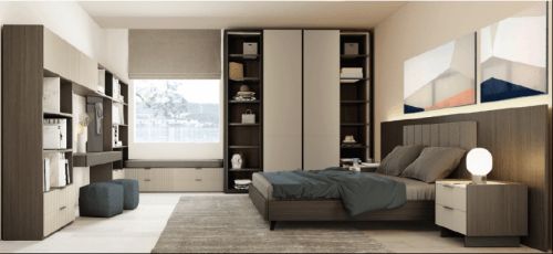 卧室是休憩之所,曼特宁系列在设计上着力打造温馨舒适的氛围,配色相对公共区域更加静谧温馨。深色木纹中调和暖灰调,恰到好处的深浅搭配使整个空间在意式风中隐隐透出优雅温柔。满墙衣柜的简洁门型和独特的线条感拉手设计,奠定整体的轻奢基调。梳妆柜、飘窗柜、衣柜和一体化床头柜的组合设计,实现形式与功能上的完美统一。
