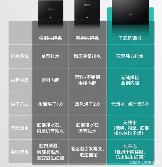归纳起来,华帝纯干态3.0技术,比较传统的洗碗机,主要表现在排水系统、内胆材质、烘干方式、有无残水和存储效果等五个方面的技术升级,相关技术参数和效果对比,可以从下表对比说明中,发现其与众不同之处。