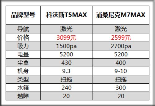 两款比较相像的扫地机器人分别是浦桑尼克扫地机器人M7MAX和科沃斯扫地机器人T5max,先一张配置表让大家直观了解两台扫地机器人有什么区别。