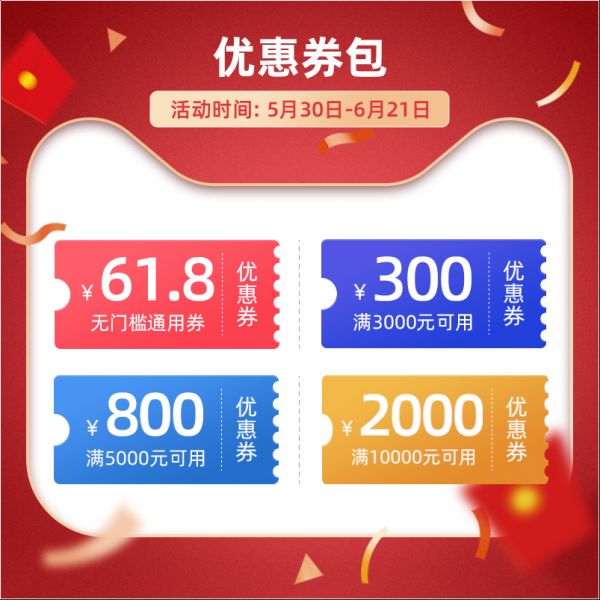 活动期间,居然之家官方旗舰店6.18元购买三千一百六十元优惠券包(61.8元无门槛通用券、满三千元减三百元、满五千元减八百元、满一万元减两千元优惠券各一张),每个ID限购一套。满减券单笔合同限用一张,可与61.8元通用券叠加使用,不可用于特价及秒杀款商品,不与店内其他优惠叠加。
