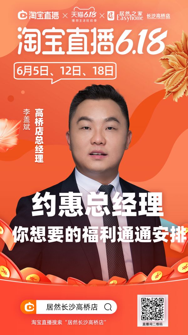 即日起至6月21日,居然之家联合场内百家大牌约惠总经理,在线秒杀爆款、红包雨福利,尽在“居然长沙高桥店”、“居然之家长沙高桥店”淘宝直播间。