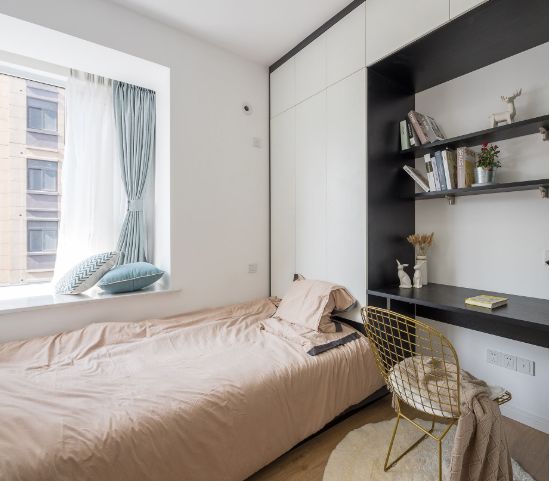 利用飘窗墙面,打造一个书柜。但是要注意采光的问题,书柜会阻挡光线射入。