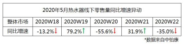 5月的热水器市场究竟有多不淡定,来看看这份数据就知道了。第18周热水器线下零售量同比增速下降13.2%,到了19周受到五一假期影响,增速达到79.2%,节后出现下滑,20周同比增速下降了55.6%,21周增速再度增长到31.9%,22周又逐渐回落,同比增速下降35.0%。
