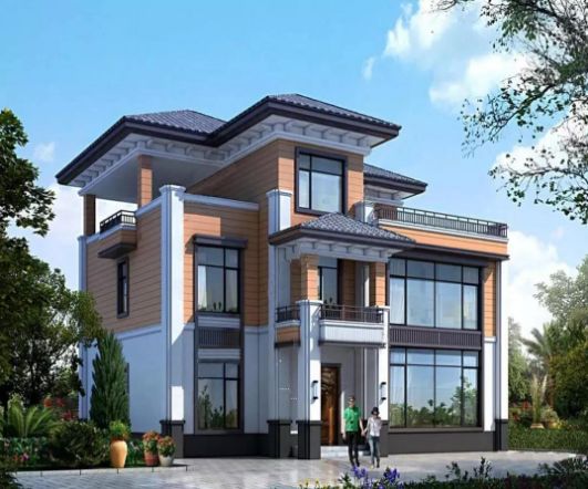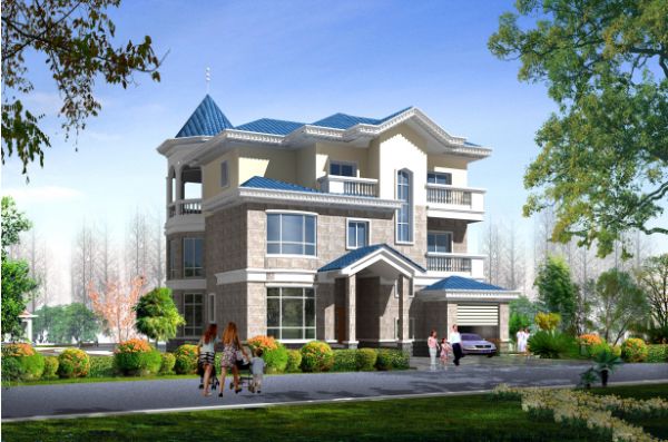 1、首先从外观上来看,这个别墅的房屋从外貌看上去非常豪华,而且别墅型的一些结构,再搭配上浅灰色的瓷砖与蓝色的琉璃瓦,可以说的颜色搭配的非常协调,让房屋更加有了实用性基础上更加的舒适,美观。而窗户玻璃的设计,还能够增加室内的通风与采光度,让室内会更加的明亮,在一楼大门边上还设计出一个车库,这样方便停车。
