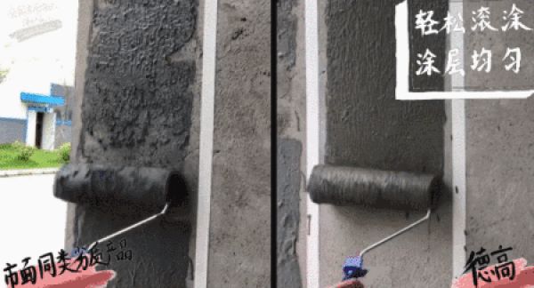 瞧,在基层上涂刷德高K11防水砂浆(柔韧型),不费劲,轻轻松松就能均匀滚涂。而且涂层粗糙,非常适合后续的贴砖施工。