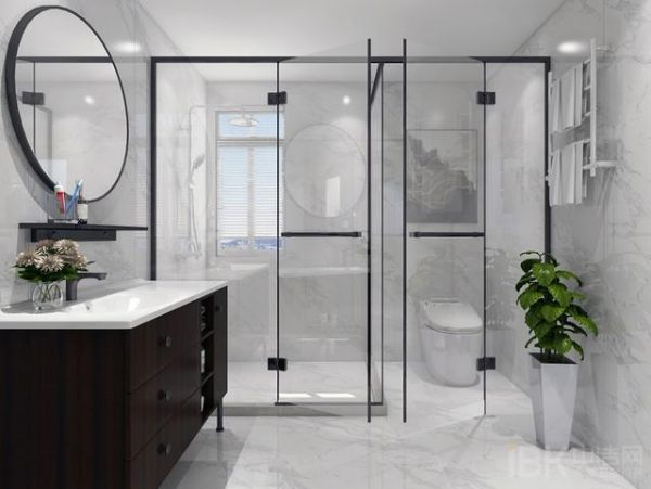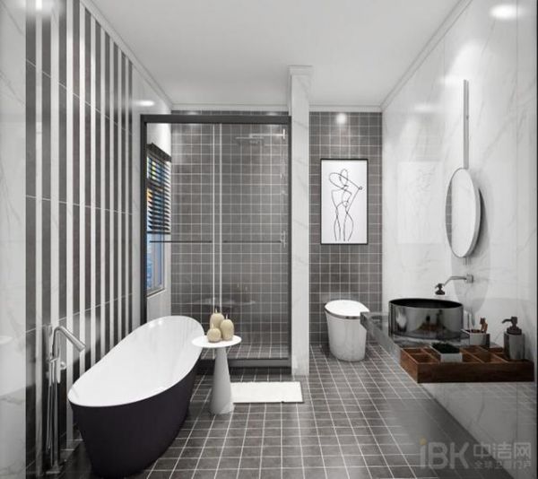 现代简约风格: 决定卫生间风格大部分取决于卫生间墙砖地砖的颜色搭配,一个让人眼前一亮又简约明了的色系搭配无非离不开黑白灰:让地面砖和淋浴房、马桶背景区域联通起来,采用黑色格子砖,空间更大又不失乏味,其余地方则是白砖搭配。