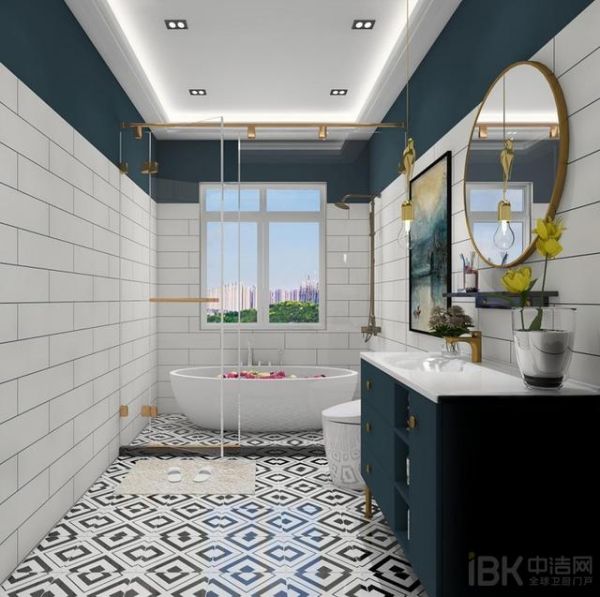 选用蓝色的原因:蓝色给人一种舒适,心旷神怡,自由的感觉,一般我们都会选择在繁忙一天的工作后,走进浴室,淋浴,泡澡,结束繁重的一天。配色上选取部分蓝色,来烘托卫生间的整体氛围,高级灰蓝又恰好提升了整个淋浴房的格调。 浴室柜的选色上和墙面有个蓝色交相呼应。配饰上点缀的金色,既提高了整个空间的高级感,而又不会显得那么浮夸。