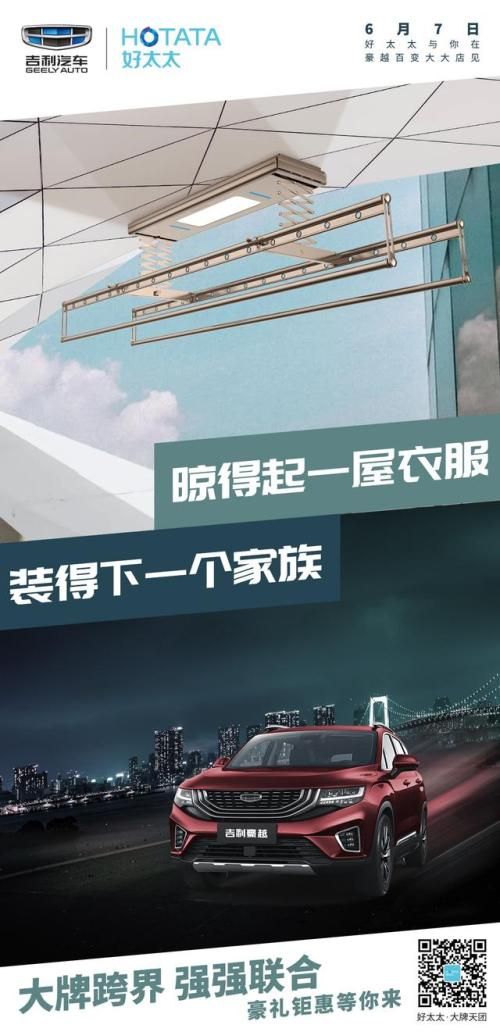 大牌与大牌的"抱团"合作,充分挖掘各自的品牌"想象空间":吉利豪越延续吉利"扩散的宇宙回想"的设计语言,外形紧凑却不损失车内可用空间,独特设计形成更大的后备箱储物空间。以豪越后备箱为展示"橱窗",好太太巧妙融入最新款"小金刚"系列智能晾衣机,纤细轻盈的外形、节省更多阳台空间,又仍然具备着消毒抑菌等强大功能。两大新品联袂亮相的背后,不难发现这样的洞察:作为各自领域的老牌"领军者",吉利与好太太深耕产品创新、不断突破技术壁垒,在持续"闯关"、驱动行业发展的同时,也在为当下消费者带来更优质、更舒适的生活体验。