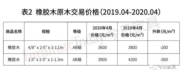 和2019年4月同期相比,橡胶木的价格跌幅达到200~300元/m³。(见表2)