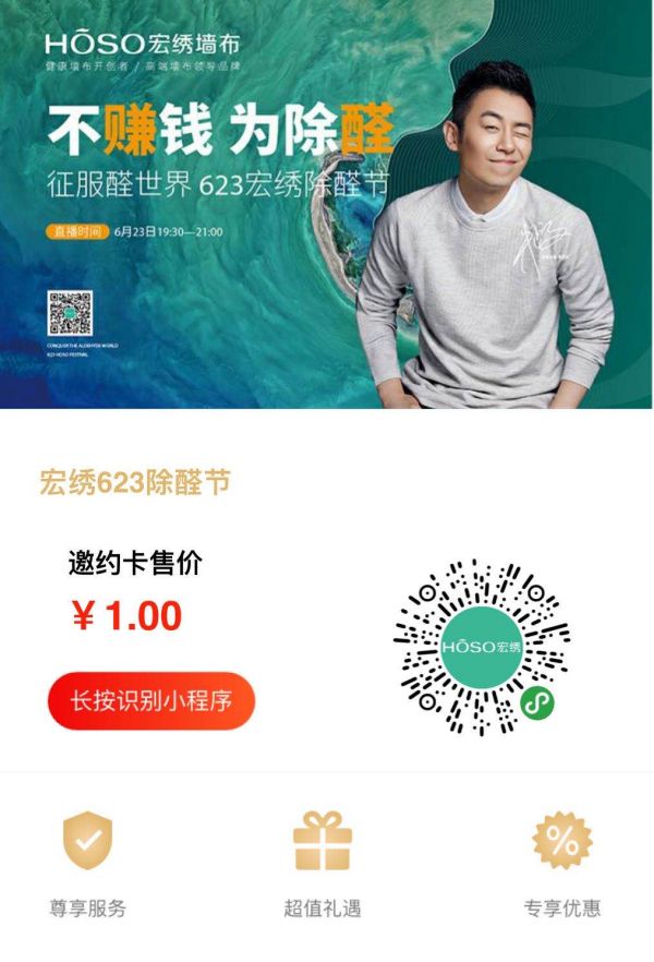 怎么参与活动?各位业主朋友可以到你所在地的宏绣专卖店,直接参与除醛节活动,也可以识别下面小程序二维码,购买1元除醛节特权卡,到时候就有客服专员邀请您进入623直播间啦~