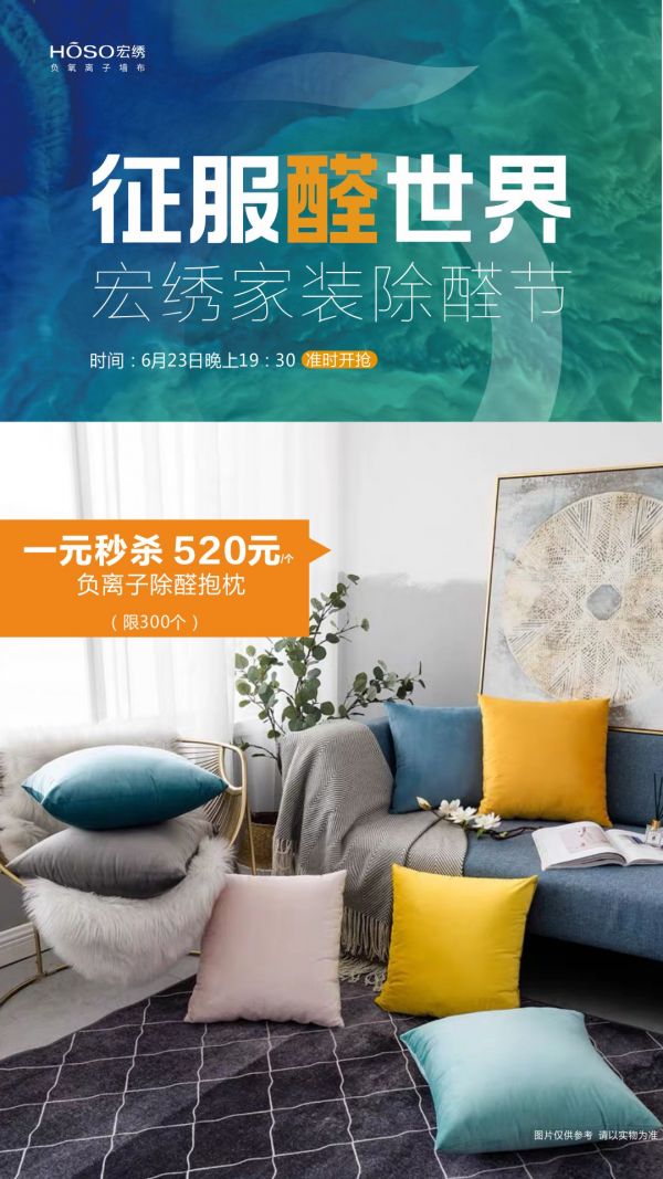 除了0元免费送墙布外,这次宏绣还准备了不少特价墙布,1元秒杀520元/个负离子除醛抱枕,199元抢全房墙布,宏绣在这次活动上真的下了血本了。