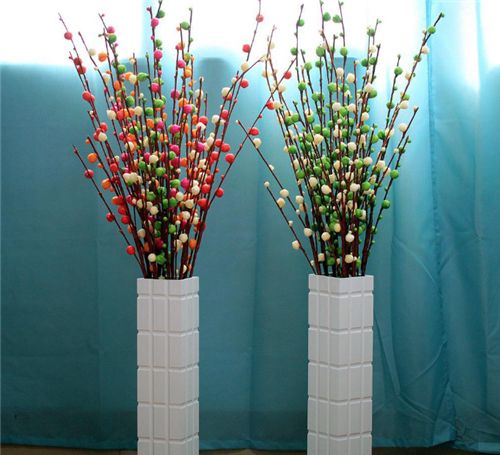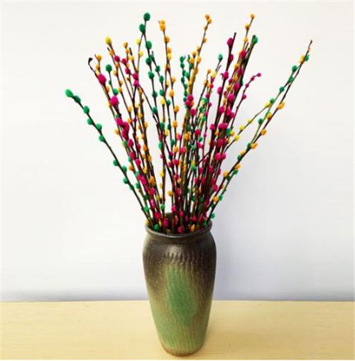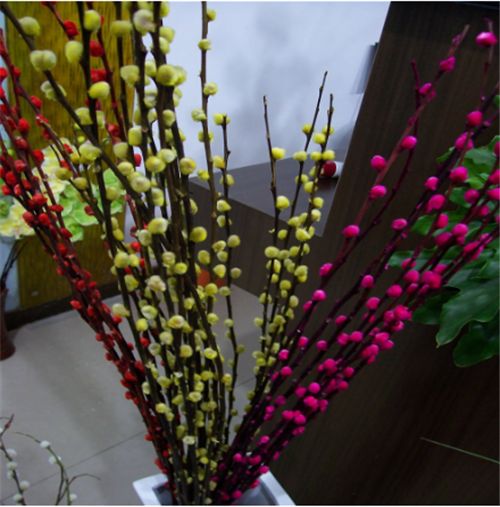 2、银柳它所展示的颜色我们都知道是银白色的,市场上有些银柳所展示为五颜六色,这是因为商家对银柳进行染色的原因,要是想把银柳放在花瓶里来作为观赏,其实这样花瓶里是不需要放水,当干花一样放在花瓶里就可以了,这样可以观赏一年。
