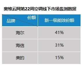 与行业低价清库存的做法不同,一些率先布局新能效的品牌开始收获市场红利。奥维云网数据显示,第22周,在线下空调市场,海尔、海信、美的居新国标一级能效市场TOP3。其中海尔空调占比41%、海信空调占比31%、美的空调占比15%。
