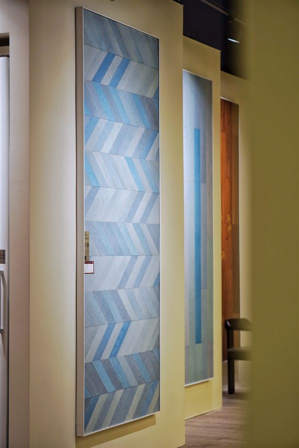 进门第一眼吸引大家眼球的就是色彩鲜妍的郎科罗系列,据介绍,郎科罗系列是法国色彩大师郎科罗从上世纪20年代兴起的Art Deco风格元素中汲取灵感设计的作品,森林之星在此基础上,创造出了郎科罗大师系列和郎科罗木本色系列,让拼花地板焕发浪漫色彩的同时,再辅以金属元素的层次点缀,彻底颠覆人们对传统拼花地板的形象,引领行业设计新方向。