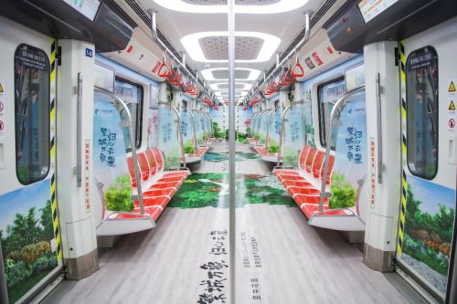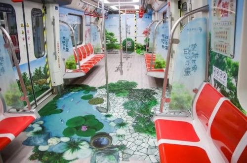 信联天地打造的“云麓号”花园主题列车,采用裸眼3D的设计,将整列地铁以“空中花园”的视角进行设计,郁郁葱葱的植被,活灵活现的3D池塘荷叶效果打造,为整列地铁营造出恬静舒适的生活美学之感。