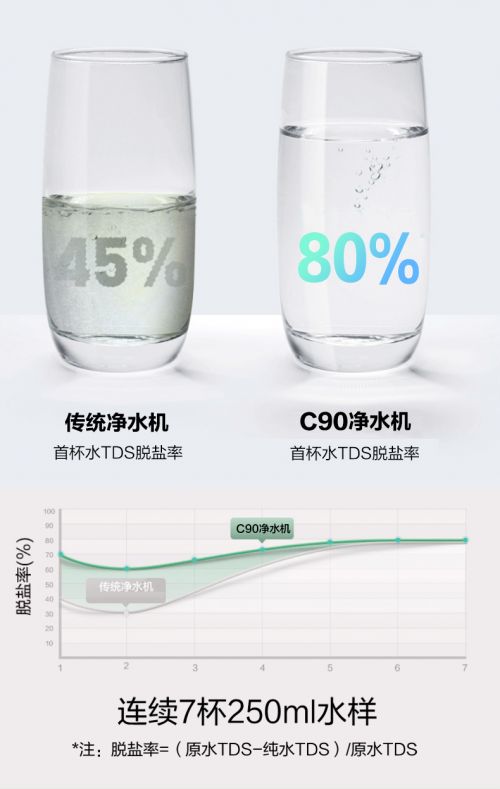 据了解,市面上普通净水机产品长时间处于待机状态后,废水中的溶质会通过RO膜渗透进入纯水端;因此当人们再次使用净水机时,接出的第一杯纯水的TDS值会很高。所谓TDS值即溶解性固体总量,TDS值越高,表示水中含有的溶解物越多,所以一般净水器长时间静置后的“第一杯水建议放掉不喝”。针对这一问题,惠而浦零陈水净水机R600C90采用了前沿纯水洗膜技术,停机后使用纯水浸泡冲洗RO膜,避免废水中的溶质渗透到纯水中,确保每一杯水的TDS值都能达到纯净水的标准,解决了头杯水TDS值比较高这一行业难题。可以说,惠而浦零陈水净水机从根本上突破了净水行业遇到的技术瓶颈,让第一杯水不用等,即开即饮、方便更健康。