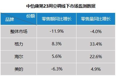 从分品牌来看,美的、格力、海尔的三分天下格局依旧稳固。中怡康第23周线下空调市场数据显示,格力空调零售额同比增长8.3%,零售量同比增长33.4%;海尔空调零售额同比增长5.6%,零售量同比增长22.6%;美的空调零售额同比增长-6.3%,零售量同比增长4.9%。