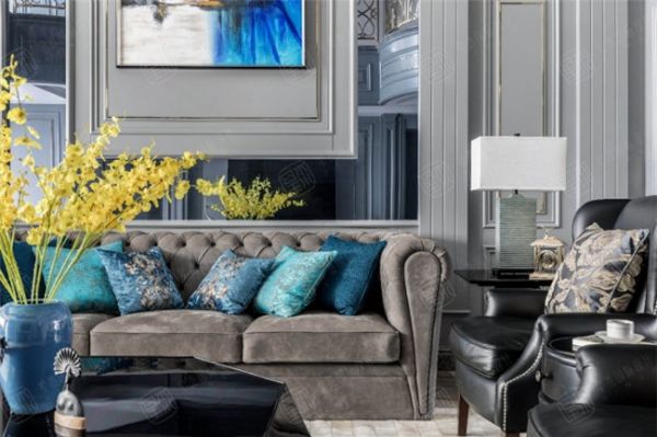 中性色调的大理石与金属元素的搭配在碰撞中和谐统一,黑金搭配的装饰画艺术感十足,让我们体验到前卫时尚的设计空间。鎏金的琉璃灯饰散发出珍珠般优雅的光泽,体现了线条的流畅饱满,蓝色与黄色的搭配让人眼前一亮,整个空间以灰色调为主,沙发上蓝色的抱枕成为点睛之笔。