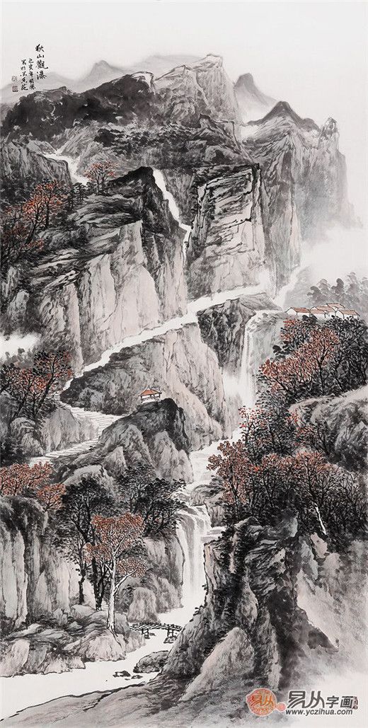 李国胜四尺竖幅新品国画山水画《秋山观瀑》 作品来源:易从网