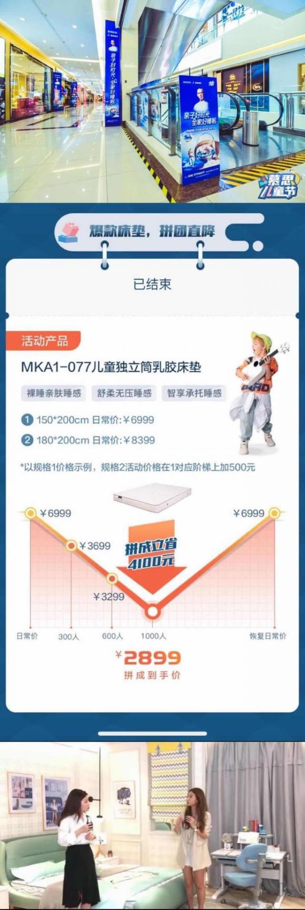为终端市场做大声量,靠的不仅仅是全国门店的布置造势,慕思儿童多个端口齐发,建立了线上推广互动以及线下消费的闭环体验。慕思儿童借势六一儿童节,在线上推出【慕思超值购】小程序,通过限时秒杀、千人拼团等举措在最短时间赢取用户,适时推出销售优惠政策,将线上用户引导到店进行体验和消费。