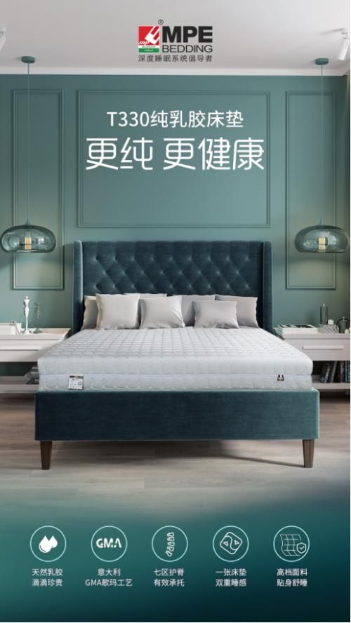 MPE T330纯乳胶床垫,更纯,更健康!精选进口天然优质乳胶,内部蜂窝状透气结构,双重透气高氧释放,加速氧分子流通,保持净爽透气的安寝环境。天然橡树蛋白分子,有效抑制螨虫、细菌的滋生。采用意大利GMA歌玛乳胶制造工艺,七大高标准生产流程,让床垫高度贴合人体自然曲线,适应各种睡姿,减轻睡眠时肌肉所受的压力,帮助睡眠者快速进入深度睡眠状态,延长深度睡眠时间。