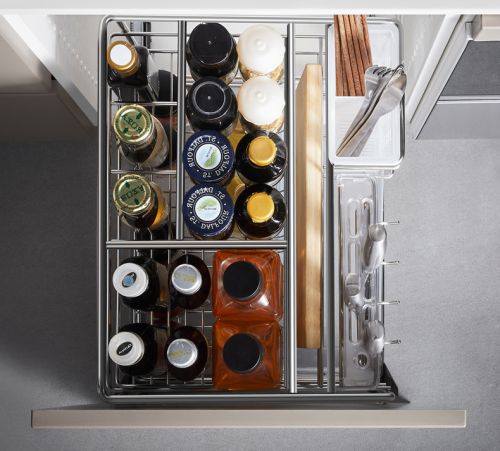 厨房空间小,除了要懂得合理分配空间,高利用率的收纳工具也是必须的。比如卡贝这款抽屉式的拉篮。