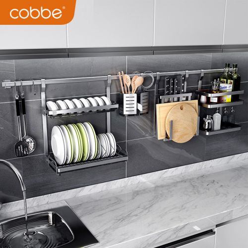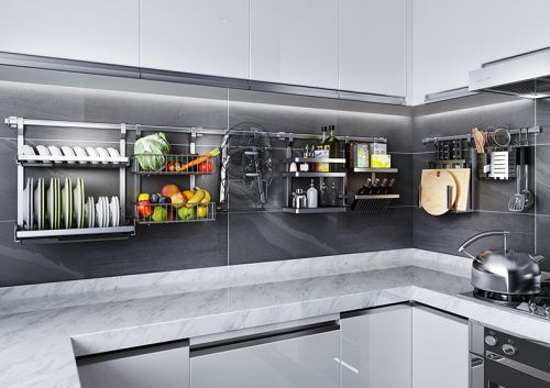 厨具、碗碟、酱油瓶、刀具等使用频繁又占地方,所以较小的厨房可以选择一个置物架,比如卡贝壁挂式置物架。