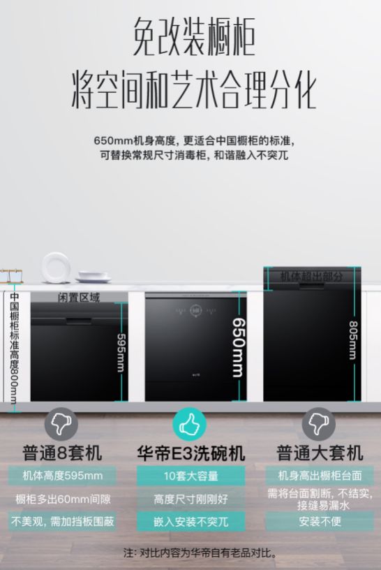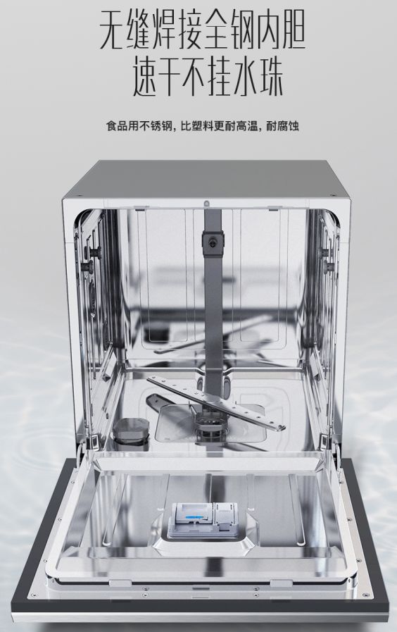 此外,这款产品还具备很多贴心设计,比如多达三层的精细不锈钢滤网、高水位防漏保护、安全溢流保护装置等等,机器使用的安全性能防护也是妥妥的。这款产品的机身高度为650mm,与中国普通家庭中橱柜的标准高度800mm十分匹配,可轻易替换消毒柜位置,免除嵌入式产品安装的麻烦。