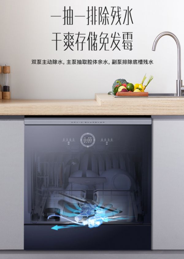 比较传统洗碗机的单泵方案,华帝干态洗碗机E3系列型号采取双泵主动去水技术,双泵双排,一抽一排,主动除水,负压空间下做到真正无水,创造干态存储环境,真正抑菌存放。